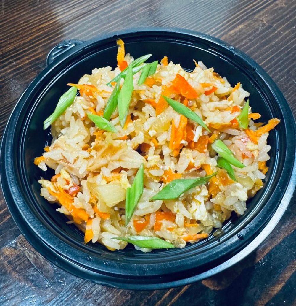 Копченая курочка, рис, чеснок, яйцо, перец болгарский, морковь, лук репчатый, лук зеленый, кунжут, соевый соус.