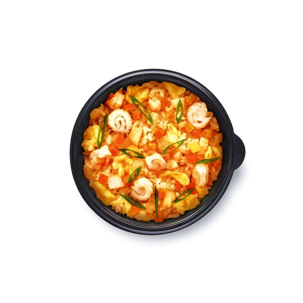 Креветки, рис, чеснок, яйцо, перец болгарский, морковь, лук репчатый, лук зеленый, кунжут, соевый соус.