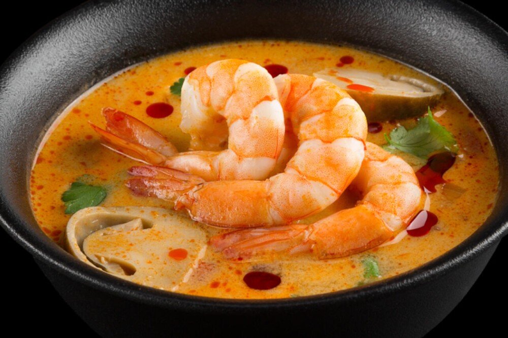 Креветки, лосось, бульон том ям, рис, шампиньоны, помидоры черри, кинза.