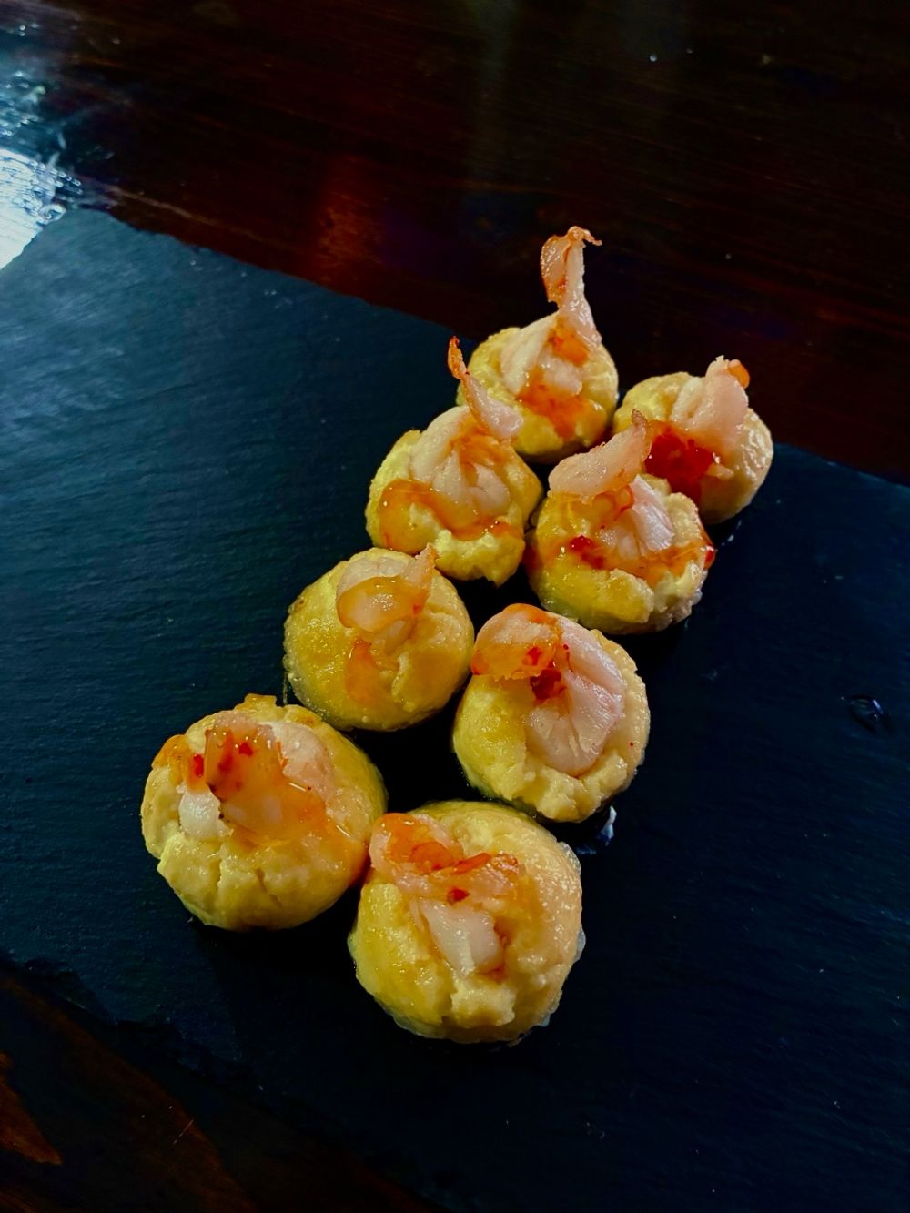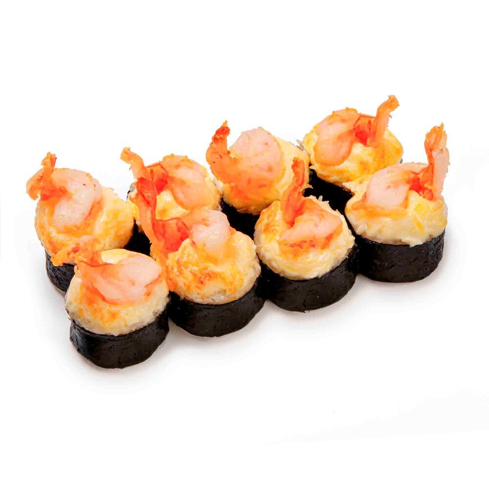 Рис, нори, соус для запекания, креветки, сыр творожный, омлет томага,соус сладкий манго-чили
