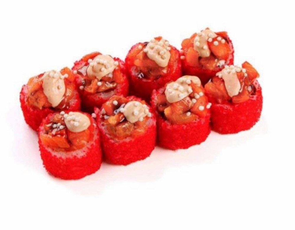 Рис, нори, рисовые шарики, сыр творожный, лосось, икра масаго, огурец, соус унаги, соус спайси