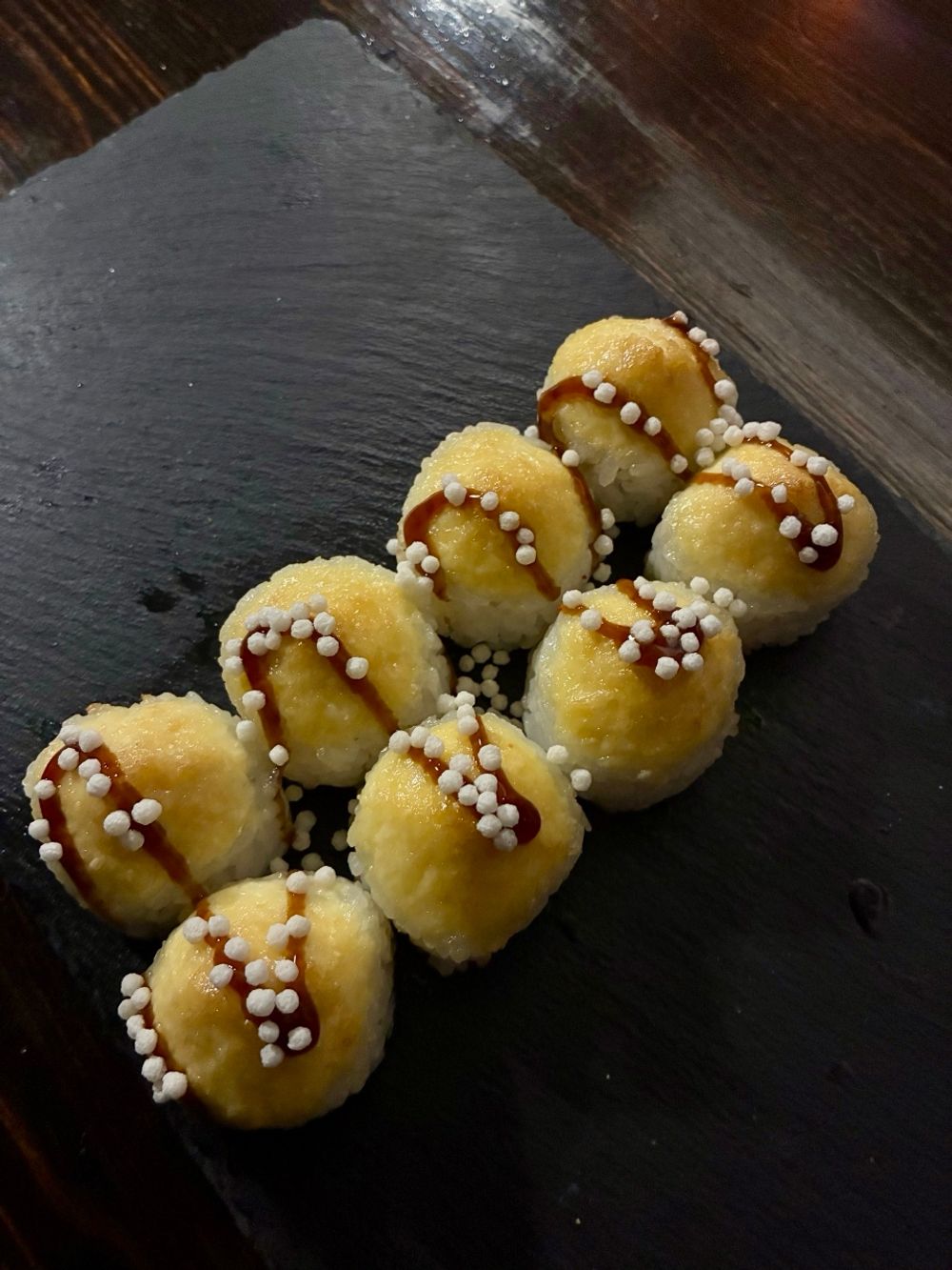 Рис, нори, сыр творожный, тамаго, огурец, соус для запекания, рисовые шарики, соус унаги