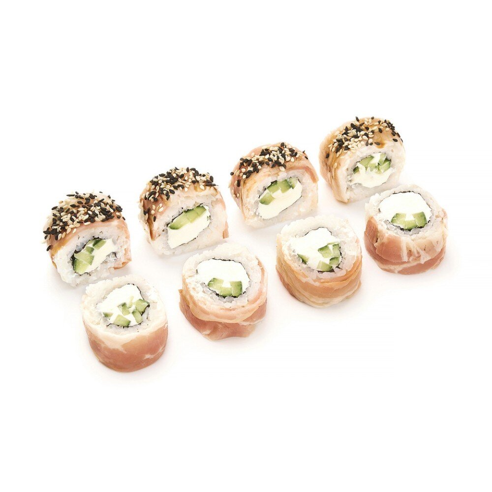 Рис, нори, сыр творожный, огурец, бекон, соус унаги, семена кунжута