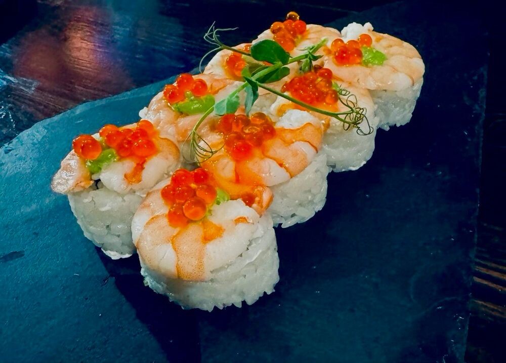 Рис, нори, сыр творожный, тамаго, креветка, соус сливочный васаби, имитированная икра, микрозелень