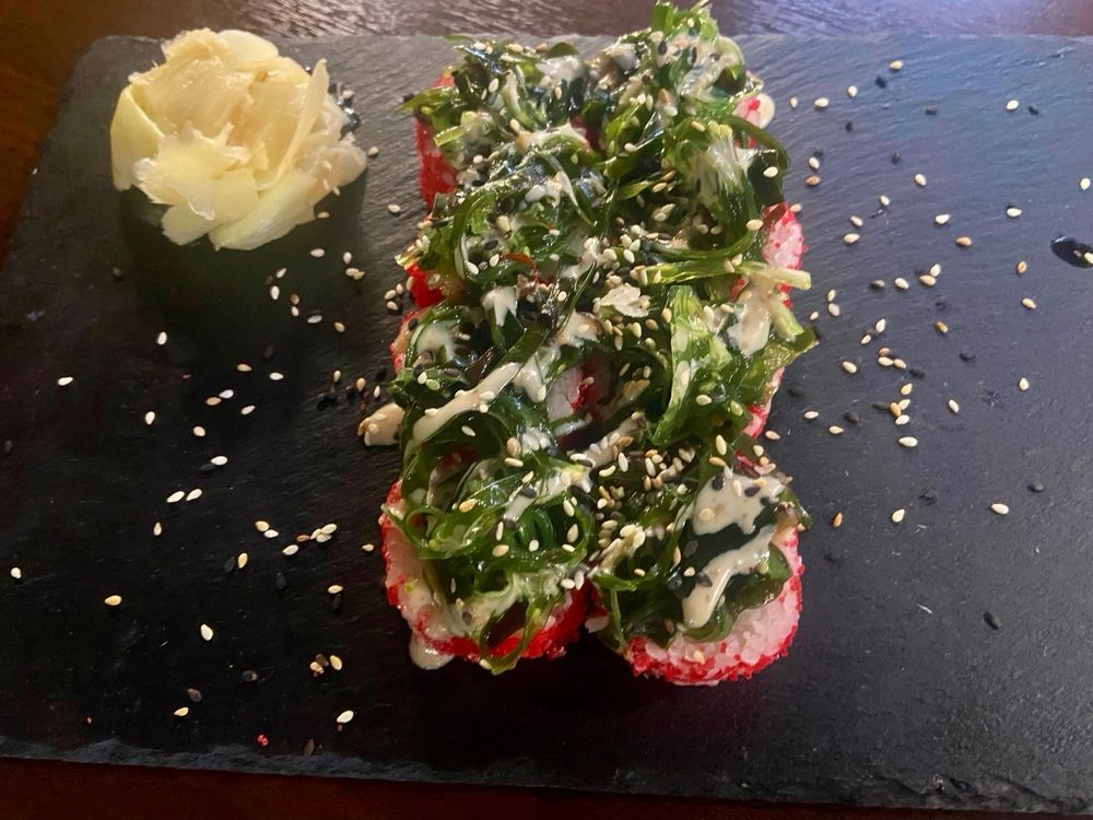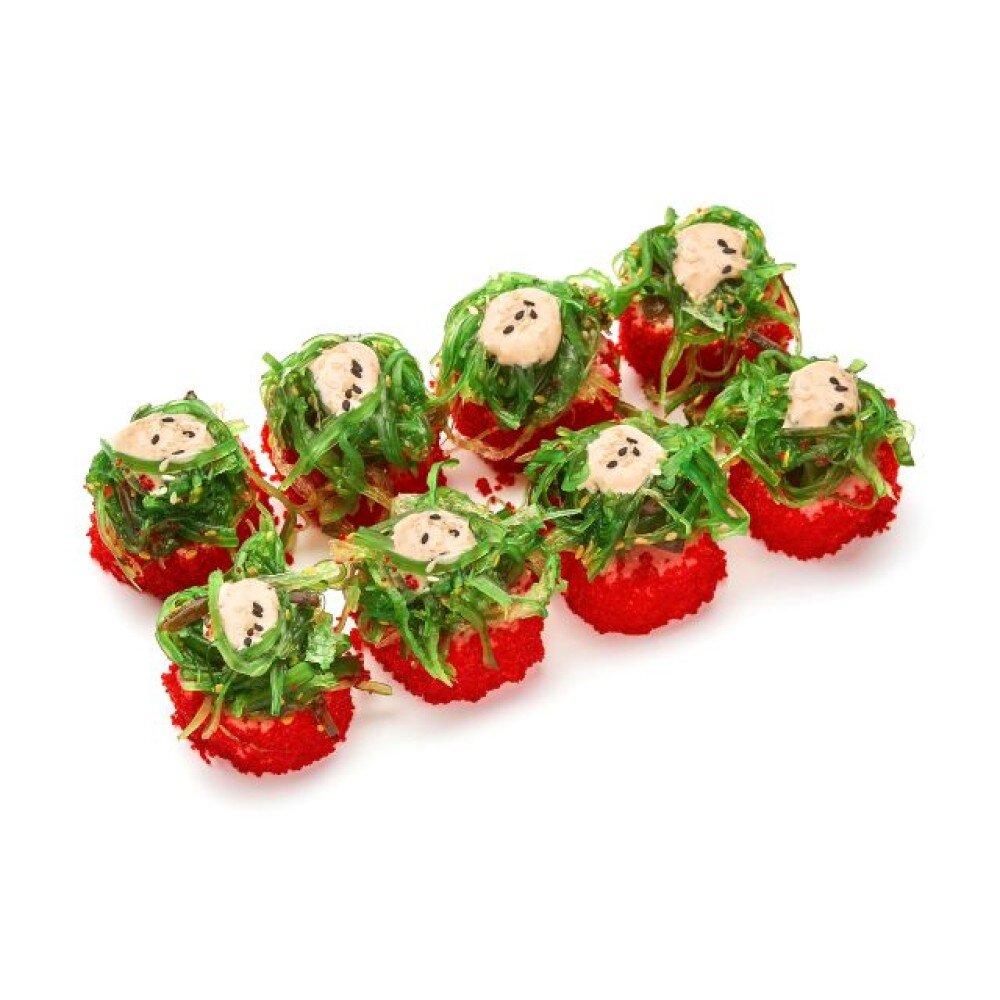 Рис, нори, сыр творожный, огурец, снежный краб, икра масаго, водоросли чука, соус ореховый, семена кунжута