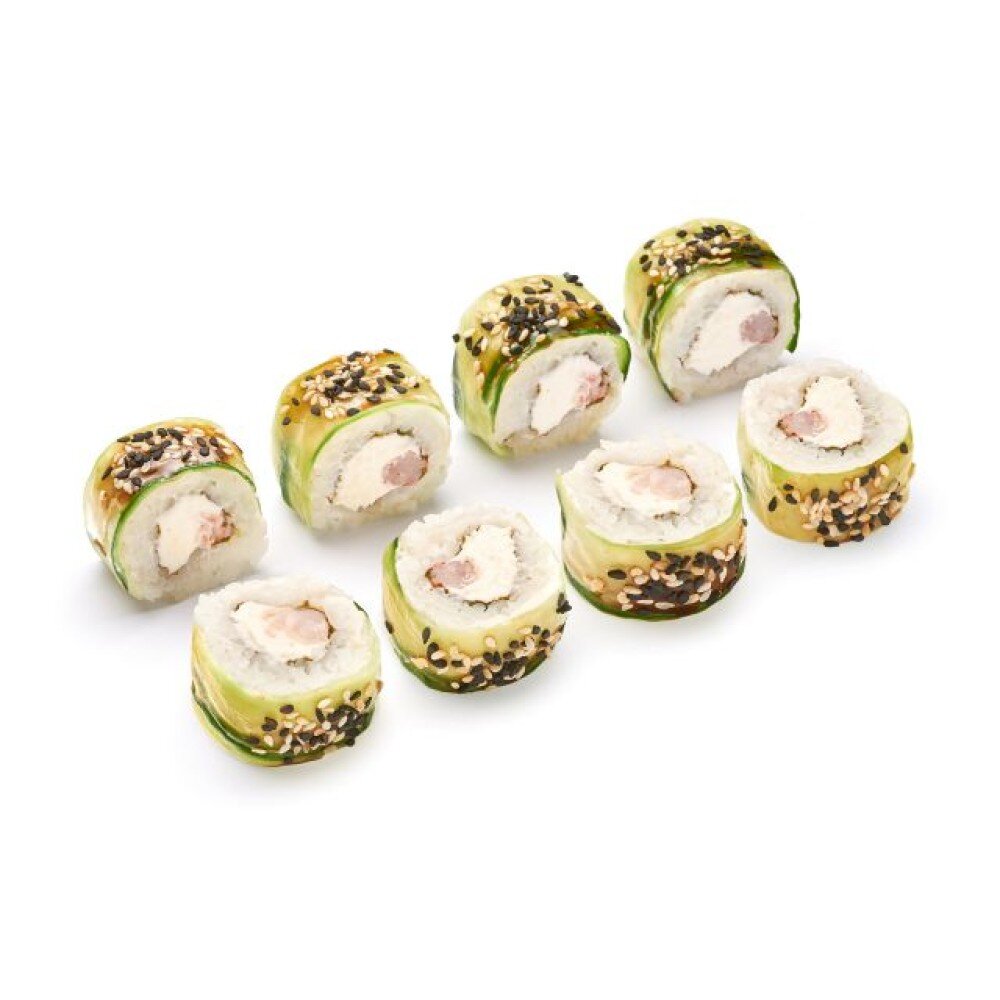 Рис, нори, сыр творожный, креветка, огурец, соус унаги, семена кунжута