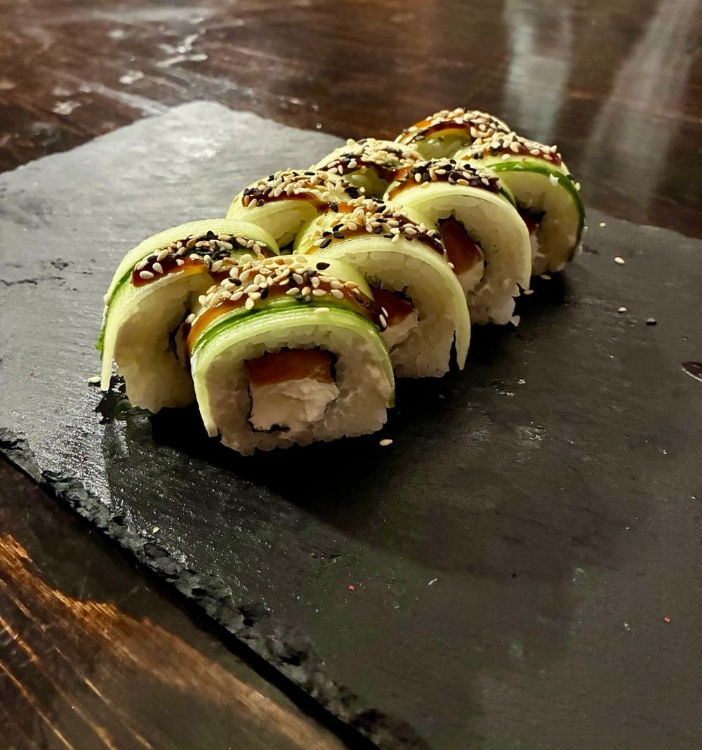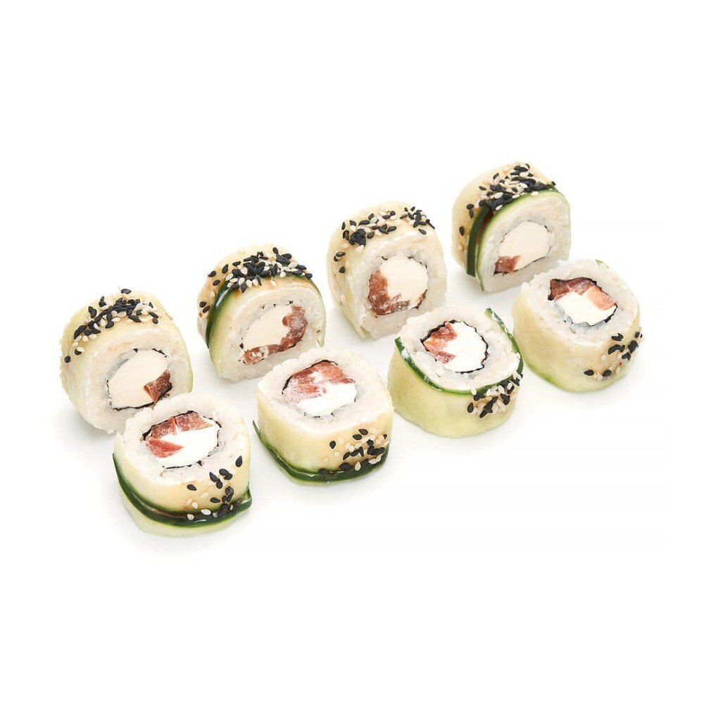 Рис, нори, сыр творожный, томаты, огурец, соус унаги, семена кунжута
