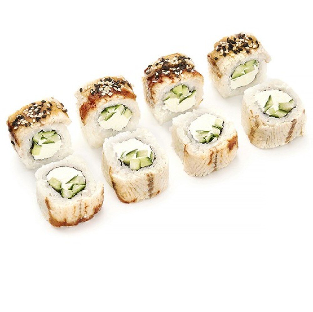 Рис, нори, сыр творожный, огурец, угорь, соус унаги, семена кунжута (ВОЗМОЖНО ПОПАДЕНИЕ МЕЛКИХ КОСТОЧЕК В УГРЕ)