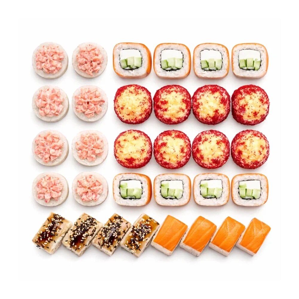 Фила лосось лайт, Порк ролл, Розовый фламенко эби, Запеченный с крабом
