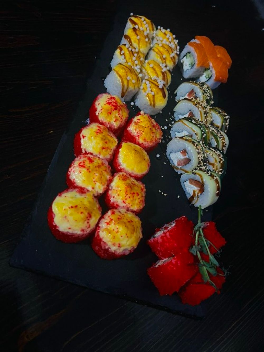 Фила лосось лайт 1/2, Калифорния с крабом 1/2, Зеленый бит вега, Запеченный лад, Запеченная калифорния