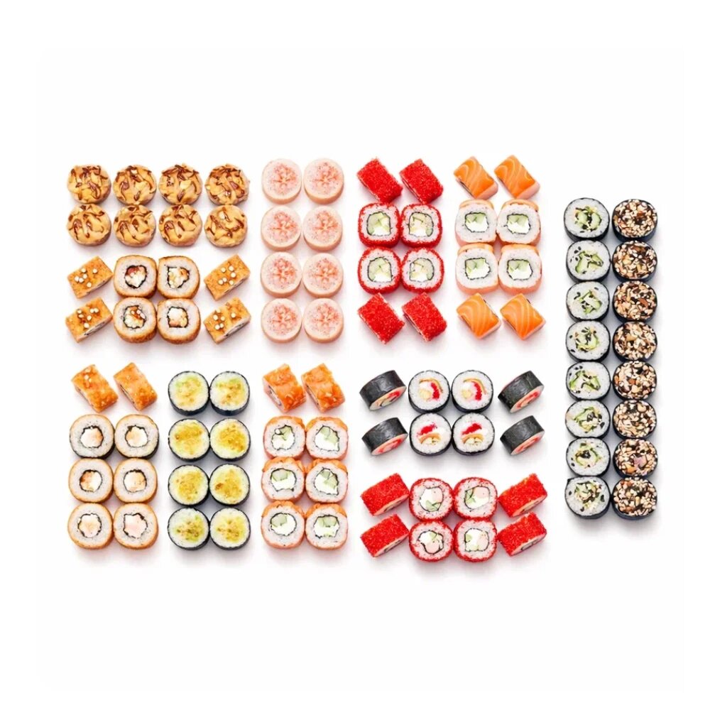 Фила лосось лайт, Калифорния с крабом, Футо сливочный сяке, Калифорния с креветкой, Фила тартар с лососем, Запеченный с тунцом, Запеченный с курицей, Розовый фламенко кани, Жареный с курицей, Жареный с лососем, Маки с омлетом, Маки с огурцом