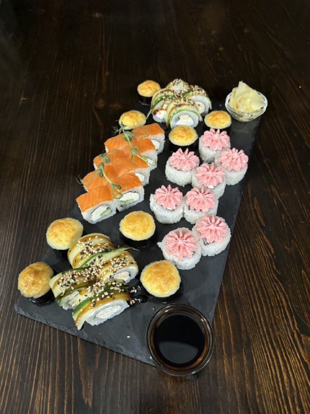 Фила лосось лайт, Зеленый бит кани, Розовый фламенко эби, Запеченный с курицей