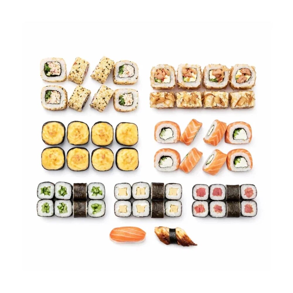 Фила с лососем, ролл Бонито, Снежный краб в кунжуте, Запеченный с курицей, Суши лосось, Суши с угрем, Маки с тунцом, Маки с огурцом, Маки с омлетом и сыром
