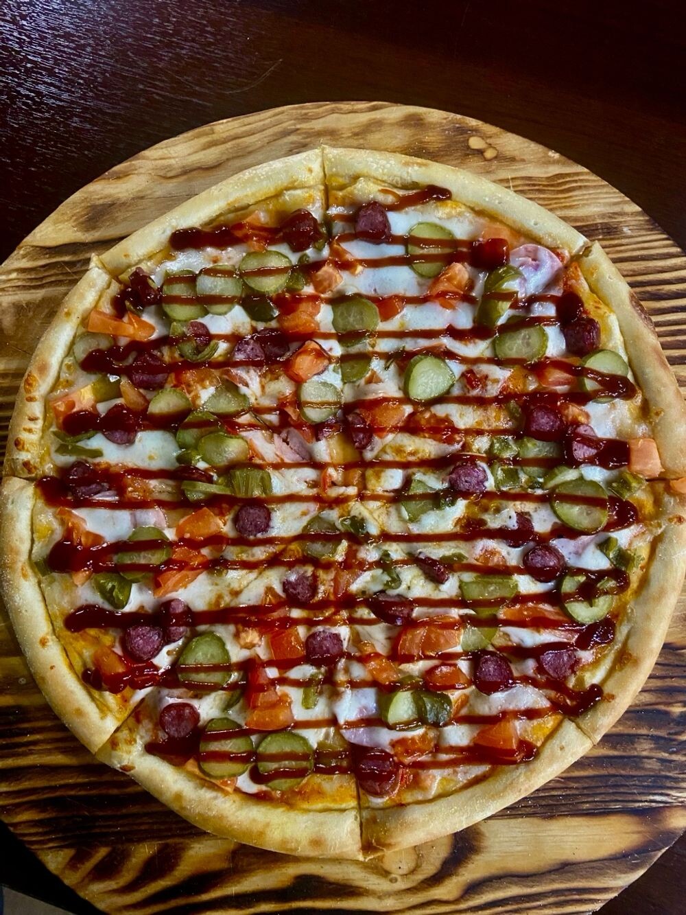 Тесто, сыр моцарелла, ветчина, колбаски охотничьи, томаты, перец халапеньо, огурцы маринованные, соус томатный, соус барбекю
