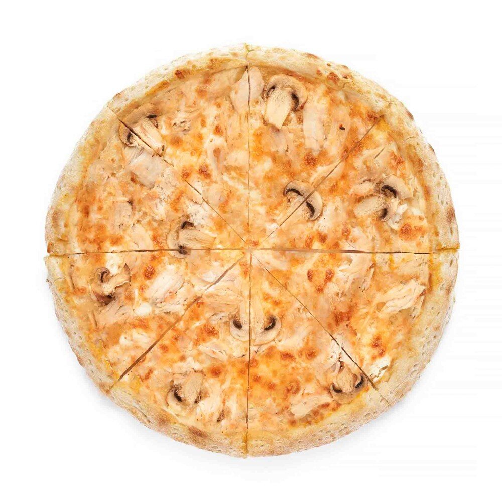 Тесто, сыр моцарелла, филе копченой курицы, шампиньоны, соус белый